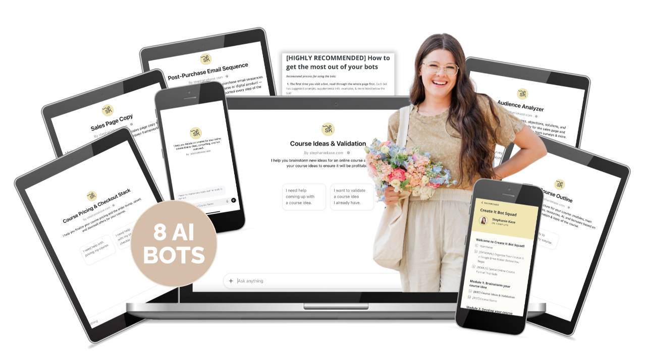 • 7 AI Bots (access in your student login): Course Ideas & Validation, Course Name, Audience Analyzer, Course Outline, Course Pricing & Checkout Stack, Course Sales Page Copy, Post-Purchase Email Sequence
